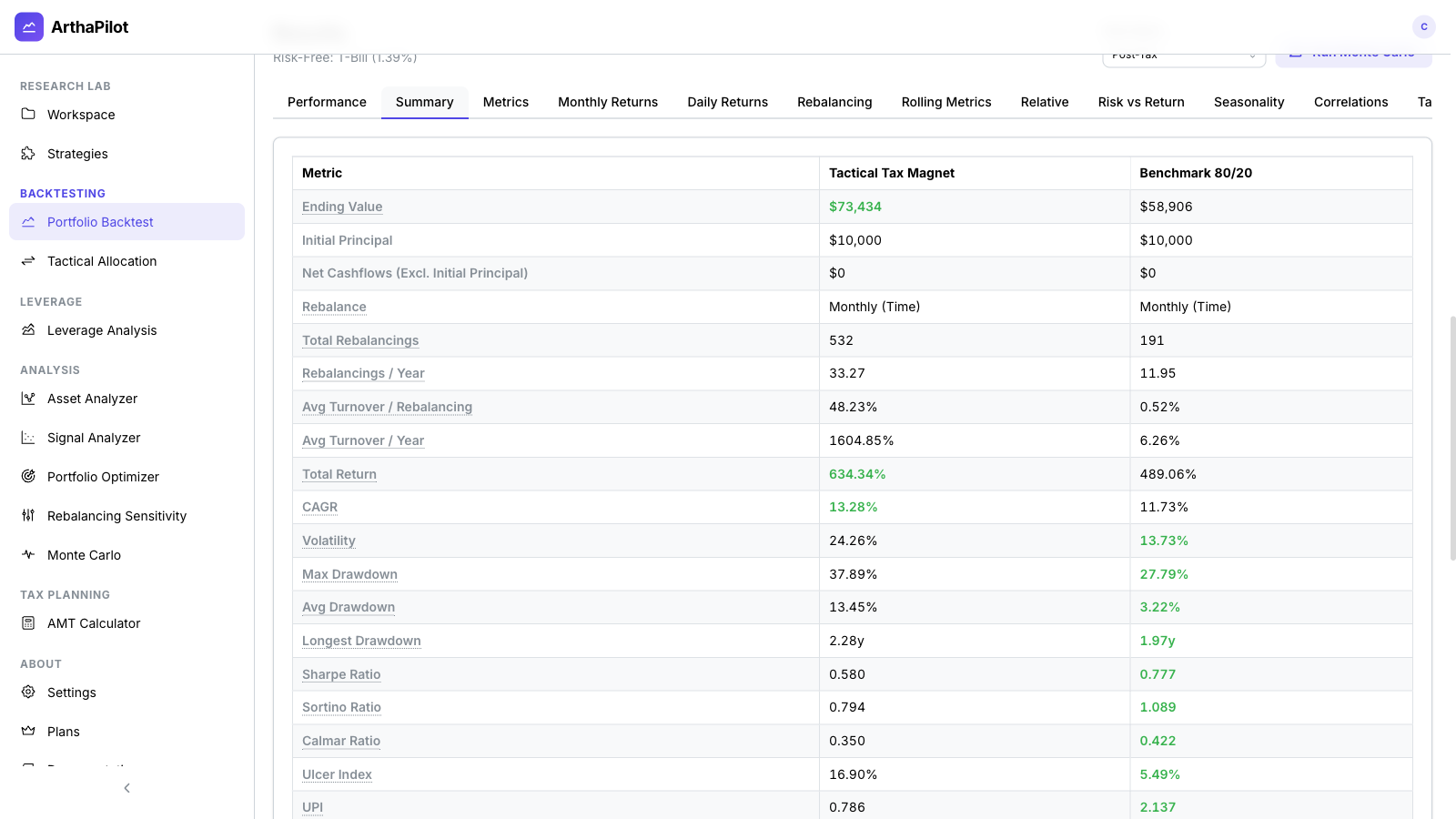 | Metric | Rule-Driven Tax Magnet | Benchmark 80/20 |